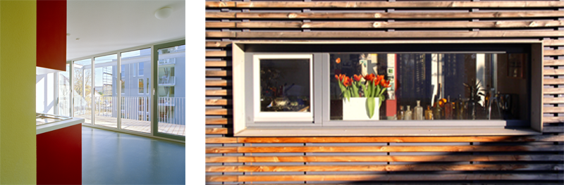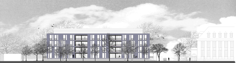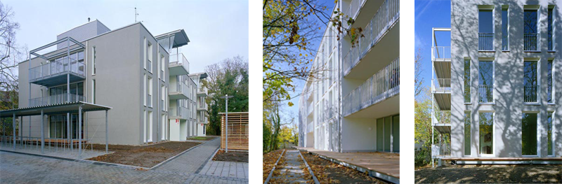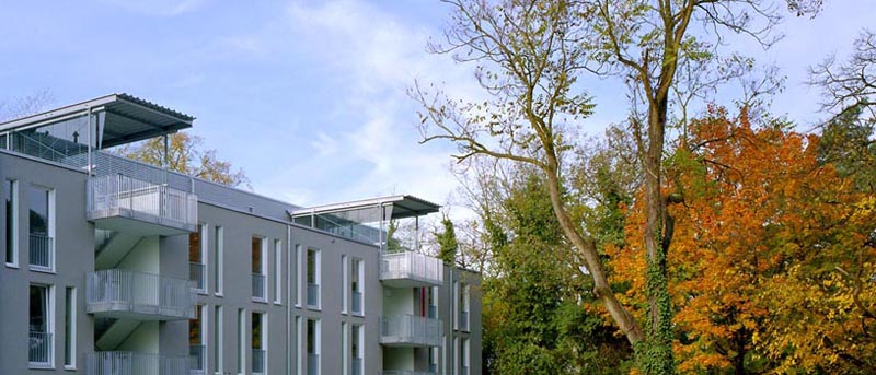Die Studentenwohnanlage ist in parkähnlicher Umgebung in der Nähe der Innenstadt und der Fachhochschule gelegen. Die 140 Zimmer verteilen sich auf zwei rechtwinklig zueinander stehende dreiund viergeschossige Niedrigenergie-Gebäude, die sich harmonisch in die Parkanlage integrieren. Die ca. 15m² großen Zimmer, jeweils mit raumhohen Fenstern ausgestattet, bilden 3er und 4er Wohngemeinschaften. Die Wohnungen haben zwei Bäder, einen großen Gemeinschaftsraum mit offener Küchenzeile dem je nach Geschoss ein großer Balkon, eine Loggia oder eine Terrasse mit Gartenzugang angegliedert ist. Der Grundriss ist flexibel und kann ohne weiteres in eine 3- oder 4-Zimmer-Wohnung umgebaut werden.