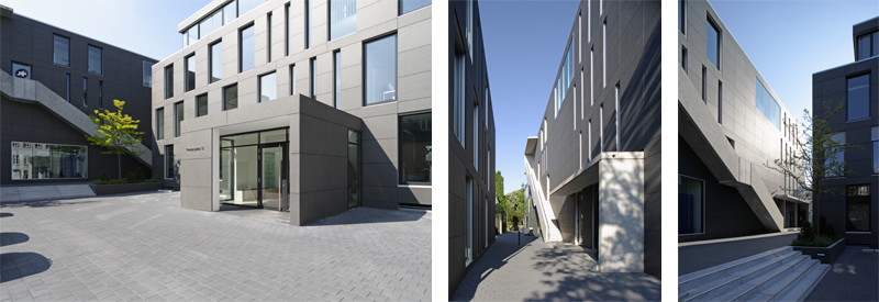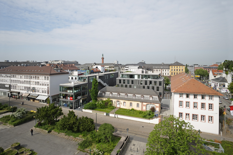 Planung für die Firma Funktion sowie das Quartier zwischen Paliparkplatz, Staatsbauamt und Friedensplatz. Auf dem Gelände zwischen Staatsbauamt, Paliparkplatz und Friedensplatz entsteht für die Firma Funktion ein 7,50 m breiter und 50,00 m langer Baukörper, der mit seiner Dreigeschossigkeit die Maßtäblichkeit der Rheinstraßenbebauung aufnimmt und zusammen mit dem Staatsbauamt das historische Gebäude des alten Waschhauses auf neue Art und Weise einrahmt. Die 6,10 m breite Passage verbindet auf attraktive Weise Paliparkplatz und Friedensplatz. Zwischen der neuen Bebauung für die Firma Funktion und dem Staatsbauamt wird ein weiteres Gebäude errichtet, das in den Obergeschossen Büros als Erweiterung für das Staatsbauamt und untervermietete Büros aufnehmen sollte. Der kleine entstehende Stadtblock kann an die Friedensplatzgarage mit einer TGA-Ebene angeschlossen werden und damit die Attraktivität dieses Bereiches durch direkten Zugang zur Tiefgarage erhöhen.