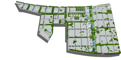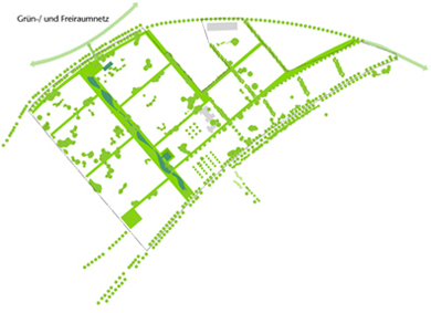 Das hochwertige vorhandene Grünvolumen des Baumbestandes wird nahezu vollständig erhalten und in ein gegliedertes „grünes Netzwerk“ integriert. Die Quartiere und Baustufen sowie die einzelnen Baufelder erhalten damit eine „grüne Erstausstattung“, die gleichmäßig alle Wohnlagen in ein ansprechendes Umfeld bettet und damit zur Adressenbildung beiträgt. Das „grüne Rückgrat“, der Nord-Süd-Grünzug, dient dabei einerseits der Vernetzung des Gesamtsystems mit den benachbarten Ortsteilen und den Freizeiteinrichtungen, bietet andererseits für die angrenzenden verdichteten Bereiche ein qualitätvolles Wohnumfeld auf zum Teil privatisierten Flächen.