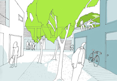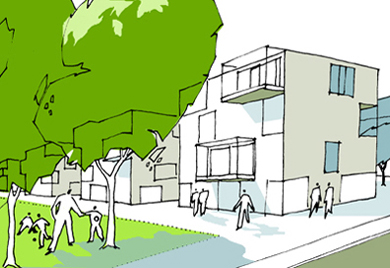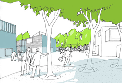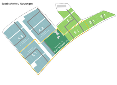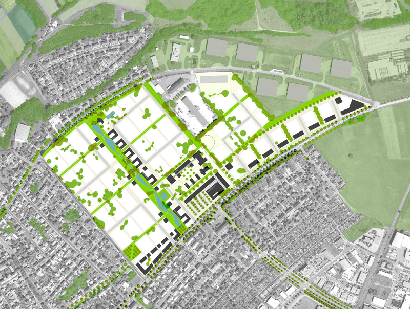 Durch das System des grünen Netzwerkes entstehen vier Quadranten, von denen drei ausschließlich dem Wohnen dienen. Der 4. Quadrant nimmt die sozialen und Versorgungsinfrastrukturen auf. Die vorhandenen Bestandsbauten (Kirche, Kasino) bilden eine Keimzelle für den umgebenden zentralen Bereich. Die einzelnen Quartiere werden ihrerseits in kleinere wirksame Nachbarschaften untergliedert, die durch die vielfältig unterschiedliche Nutzung der Baufelder jeweils einen eigenen Charakter erhält. Denkbar wäre auch, pro Quartier einen Leitbaum zu wählen, der ein weiterer Beitrag zur Identität des jeweiligen Quartiers sein könnte.
