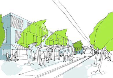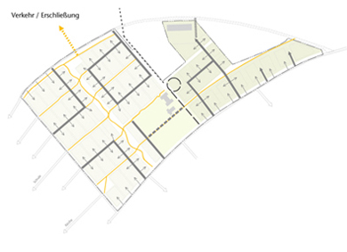 Dabei übernehmen die umgebenden Straßen Wohn- und Sammelstraßenfunktion. Ein abgestuftes System bis zum privaten Wohnweg erschließt sparsam die einzelnen Wohnfelder. Drei Erschließungsschleifen ermöglichen abgeschlossene Baustufen mit geringen Vorinvestitionen. Das Fußwegenetz überlagert die Erschließungsstraßen und ermöglicht eine gefahrlose Vernetzung der gebietsgliedernden Grünschneisen und verbindet dabei alle Wohnquartiere untereinander einschließlich der infrastrukturellen Einrichtungen. Die ÖPNV-Haltestelle wird am zentralen Versorgungsbereich in der Nähe der Kirche und des Kasinos angeordnet. Die Straßenbahn kann optional nach Norden weitergeführt werden.