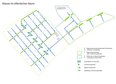 Niederschlagsabflüsse von befestigten öffentlichen Flächen werden oberflächig in Rinnen oder Ableitungsmulden abgeleitet und speisen die urbanen Wasserflächen in zentralem Grünzug. Überschüssiges Regenwasser wird beim Überstau der Wasserflächen in angrenzenden Mulden versickert.