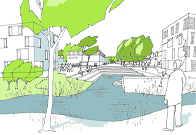 Das „grüne Netzwerk“ ist gleichzeitig Rahmen und Ordnungssystem für die Ableitung und Versickerung der Oberflächenwässer. Im Hauptgrünzug wird als Gestaltungselement eine Kette von Flachwasserzonen angeordnet, die ihrerseits aus anfallenden Oberflächenwässern der benachbarten Quartiere gespeist werden können.