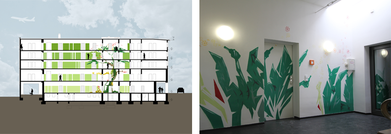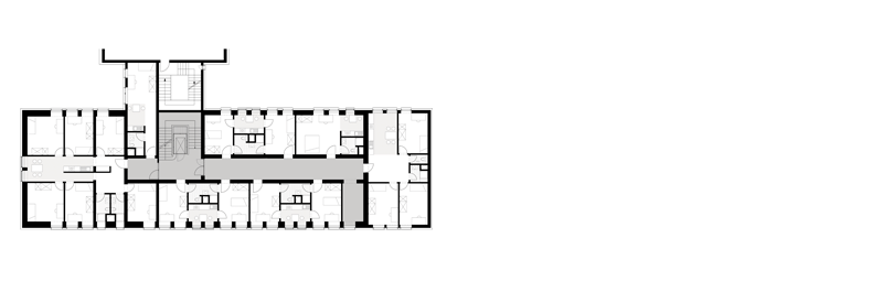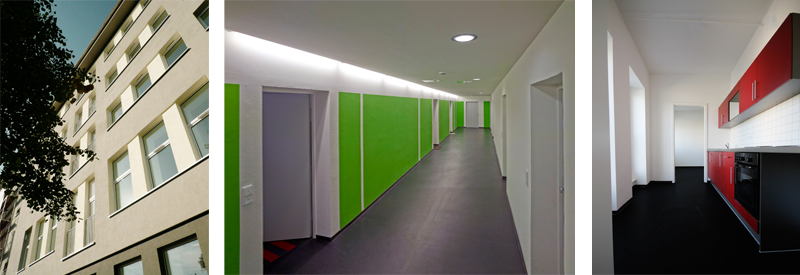 Die Wohnungen folgen zunächst der Logik des alten Behördenbaus, große Wohnungen an beiden Kopfseiten und entlang der Flure ein speziell auf dem alten Raster entwickelter Standard 2-Zimmertyp mit zentraler Sanitärzone (Küche, Bad, WC, Dusche). Standardwohnung für zwei Studenten kann auch in eine normale 2-Zimmerwohnung umgewandelt werden. Das in seiner Struktur fast ganz erhaltene Treppenhaus wird über 5 Geschosse durch ein Graffiti („Der Einsteinbaum“) farbig markiert und sollte Identifikationsmerkmal des Hauses werden. Die Flure erhalten auf einer Seite ein abgestuftes Farbkonzept, das Helfen soll den „Behördenflurcharakter“ zu neutralisieren.