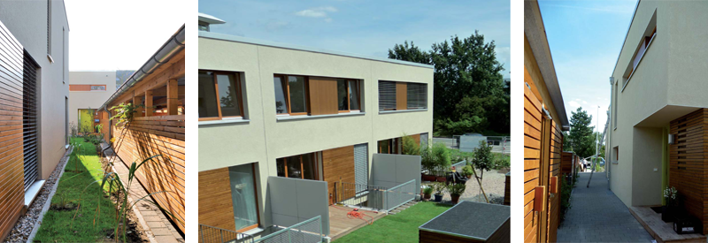 Die zweigeschossigen Wohnriegel mit insgesamt sieben Wohneinheiten entstanden in Niedrigenergie-Bauweise mit extensiv begrüntem Fachdach. Sie vereinen drei leicht verzahnt gesetzte Wohneinheiten mit einem Block bestehend aus vier Wohneinheiten. Zueinander bilden die Reihen einen Hof mit Gärten. Neu geschaffene Zugangswege verbinden die Häuserzeilen mit zwei Strassen und integrieren sich in den öffentlichen Freiraum. Die Erschließung erfolgt über den verkehrsberuhigten Vilbeler Weg. Die Wohnriegel unterscheiden sich in ihrer Typologie. Der Typ A ist 6,00 m breit und 11,25 m lang, während der Wohnriegel Typ B 8,66 m breit und 7,13 m tief ist. Daraus resultieren unterschiedliche Wohnungsgrößen und Wohncharaktere. Das Untergeschoss erhielt zum südlichen Garten einen Lichthof, so dass hier ein weiterer Raum zu Wohnraum / Hobbyraum ausgebaut werden konnte. Jede Wohneinheit hat einen eigenen kleinen Garten. Die Gebäude mit ihrer kubistischen Formensprache erhielten eine lebendig gestaltete Fassade. Holz, Putz, Fassadenpaneele und Glaselemente wechseln sich ab. Die Außenanlagen, wie Trennwände, Carport und Abstellboxen sind in das gesamte Konzept eingebunden. Beide Hauszeilen zusammen bilden stilistisch eine Einheit. Die technische Versorgung erfolgt über eine Zentrale, die im Untergeschoss des Hauses Nr. 1 untergebracht ist. Die Wärmeversorgung ist durch Fernwärme gesichert.